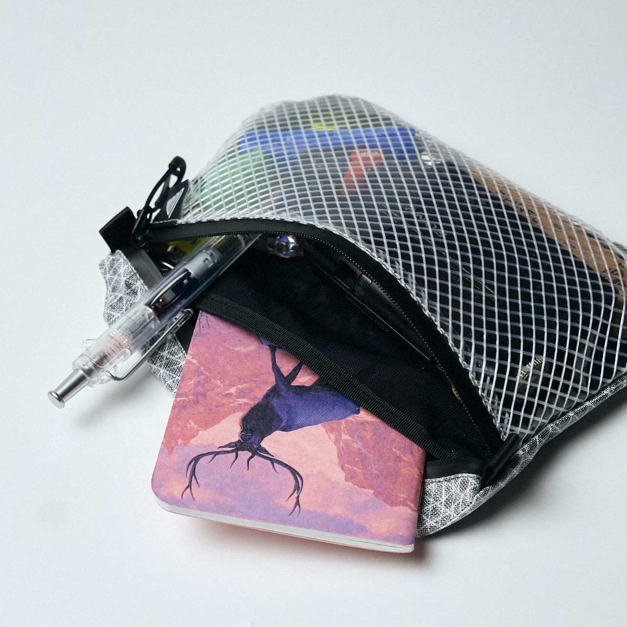 中見がすぐ確認出来て意外と容量もあるし、内部のメッシュポケットで細々したモノも整頓できるので、色々なシーンで使っていただければ嬉しいです